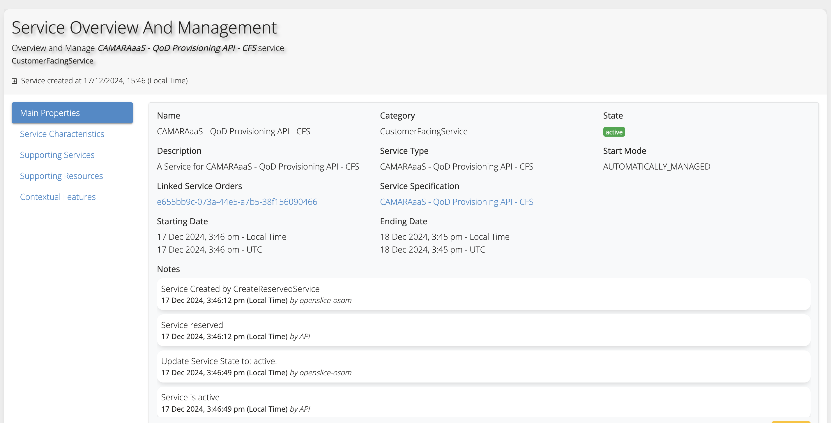 Confirm that the service order was completed, both RFS and CFS Services are active, and a Custom Resource of type CAMARAaaS-QoDProvisiongAPI was created in your Kubernetes Cluster. See images below (kubectl describe camaraaas-qod-provisioning-apis <name> -n <namespace>)