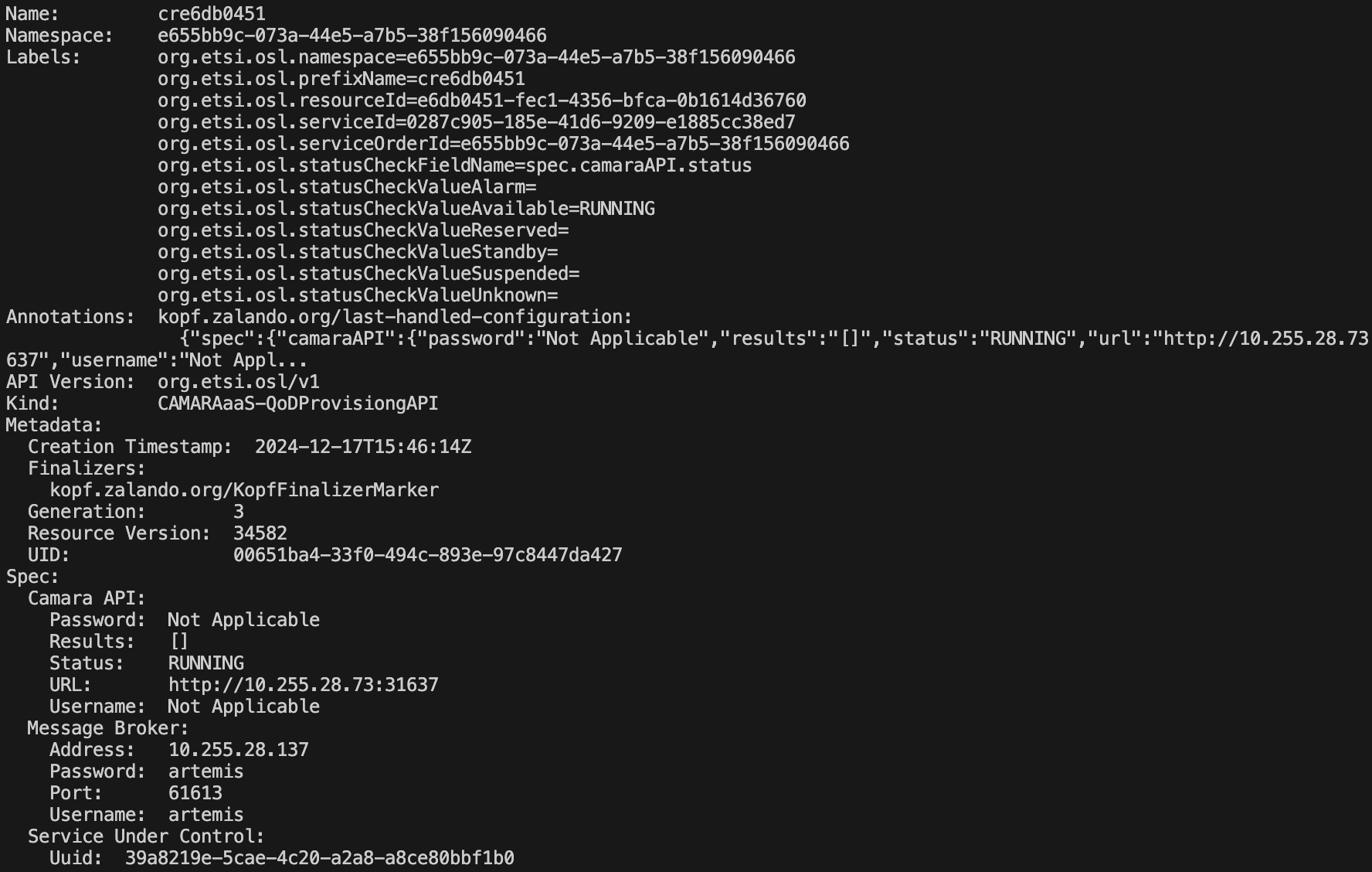 As there is no logic behind the Dummy Operator Service, the provisioning will remain with the status “REQUESTED”. However, we can simulate that Dummy Operator Service enforced a QOS enforcement, by patching its Custom Resource: