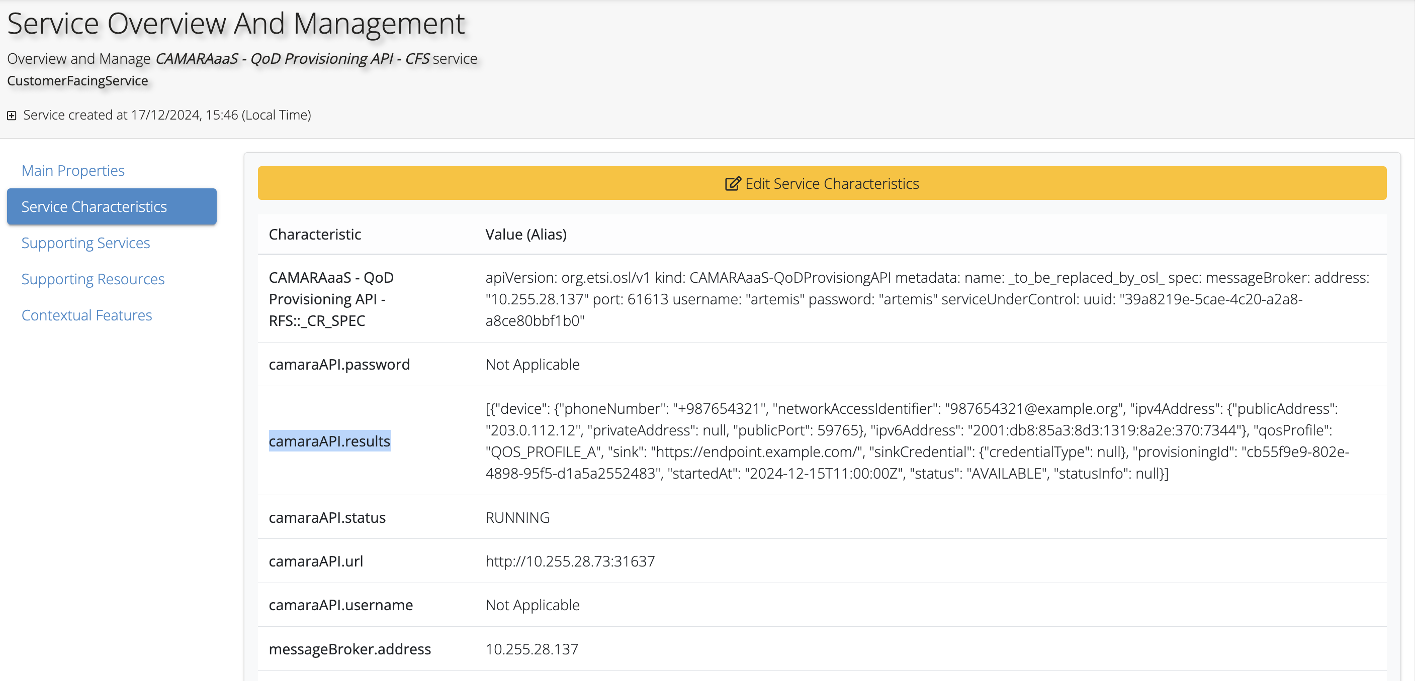 After a while, if you check the characteristics of the CAMARAaaS QoD Provisioning API CFS, you will also see that the characteristic camaraAPI.results was updated.
