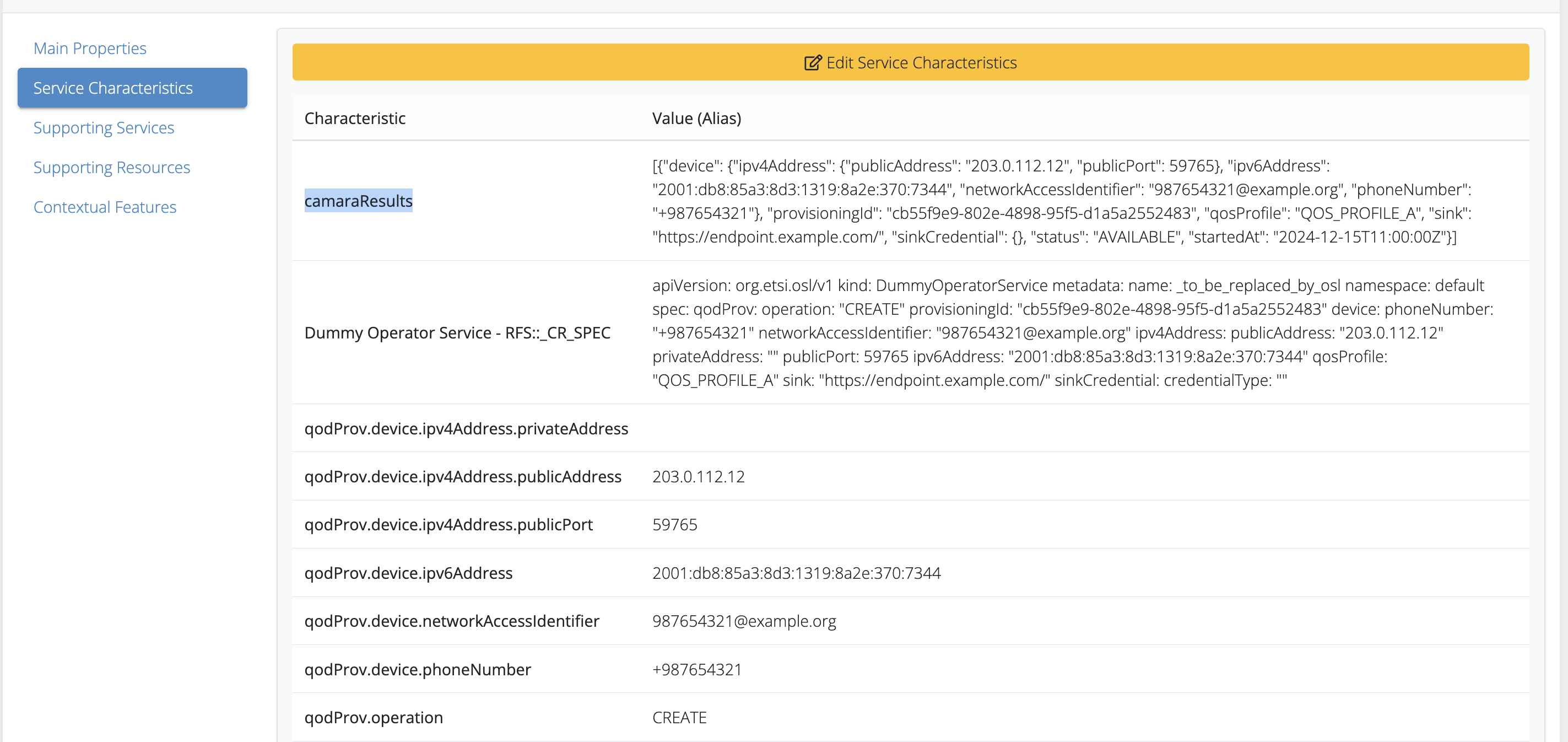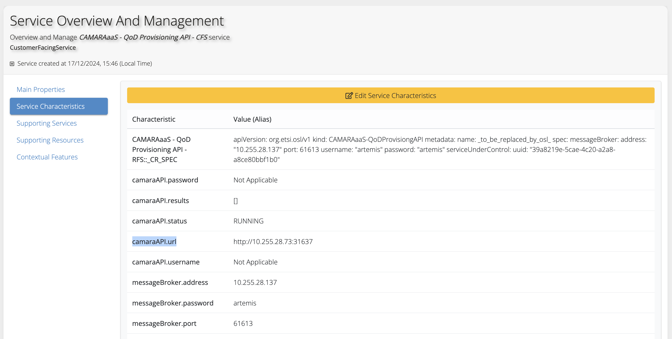 Additionally, you may create a characteristic titled “camaraAPI.results”, which you can use to have visibility of the QoD Provisionings processed by the API, at OSL level. Still, this characteristic is not required.