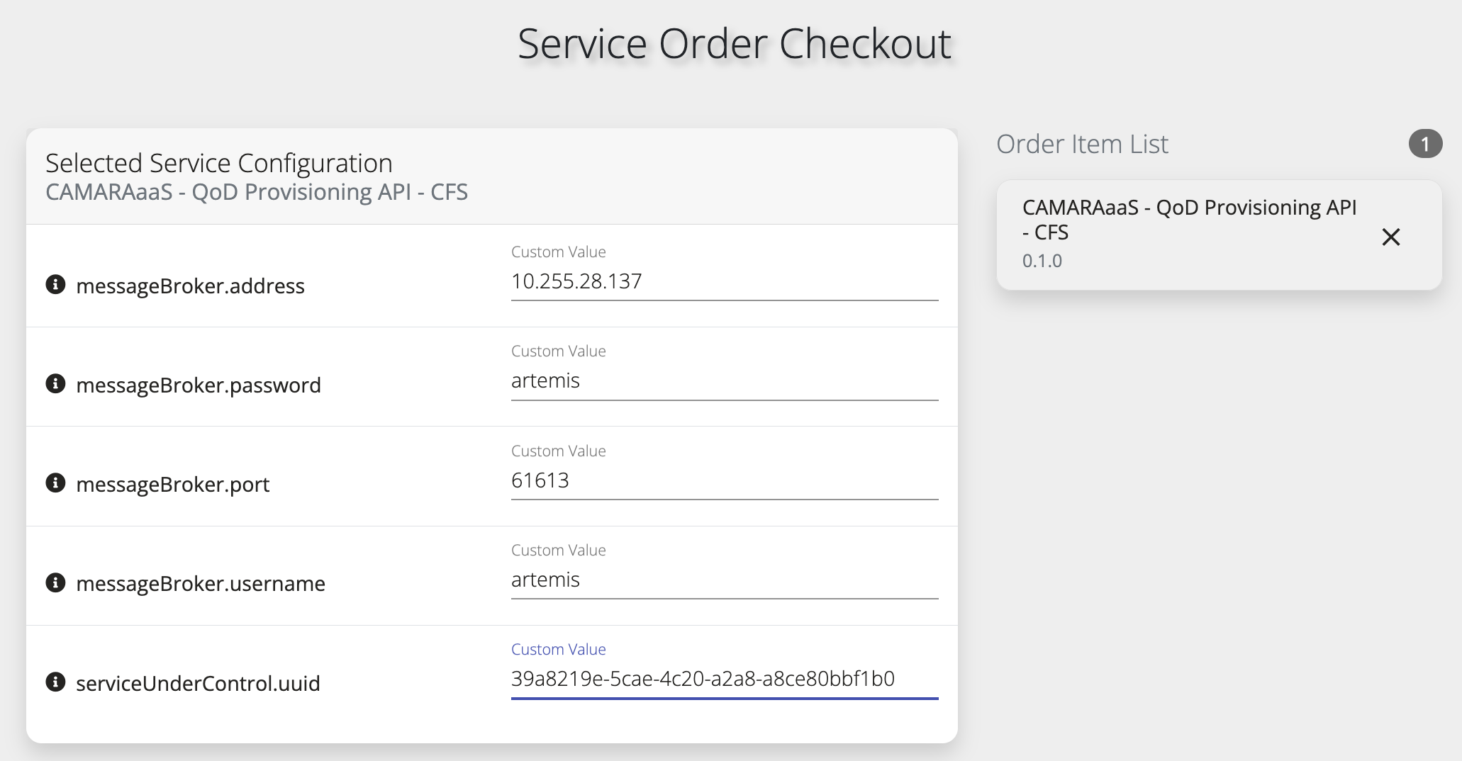 Before designing the service in OSL, let us first create a CR of type CAMARAaaS-QoDProvisiongAPI to validate that the operator is behaving according to what is expected. To this end, you may use the test custom resource available at /QoDProvisioningAPI/Operator/test-cr.yaml . Before creating the resource, you need to update the fields: spec.messageBroker.address, spec.messageBroker.port, spec.messageBroker.username, spec.messageBroker.password, with the values that relate with your OSL instance. The default values will be the following ones: