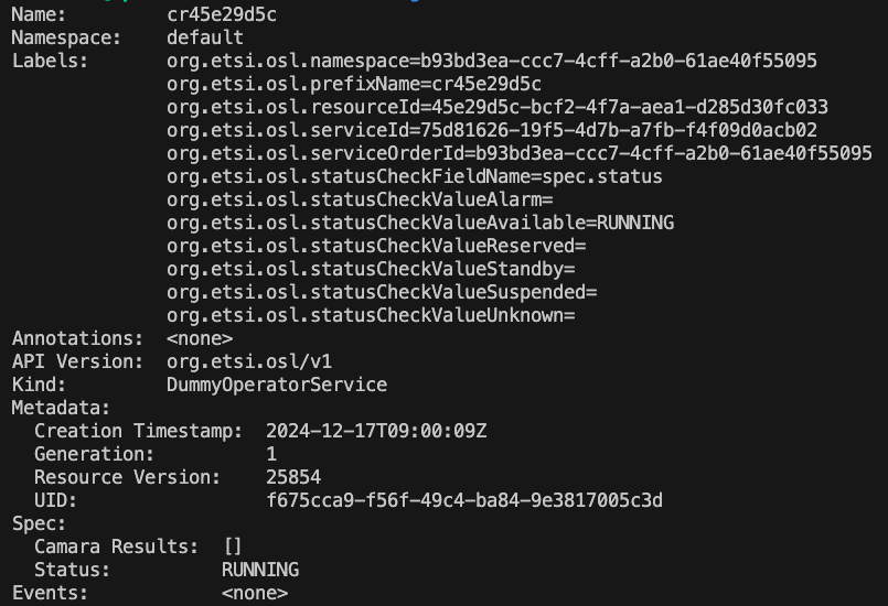 By setting these characteristics, you will rely on the value of spec.status to set the service as active. Ideally, the 5G Core provider would have implemented a proper Kubernetes Operator for this Custom Resource to implement the requested QoD. However, as discussed already, for demonstration purposes, we will short-circuit the behavior and we will set spec.status to RUNNING immediately after deployment.