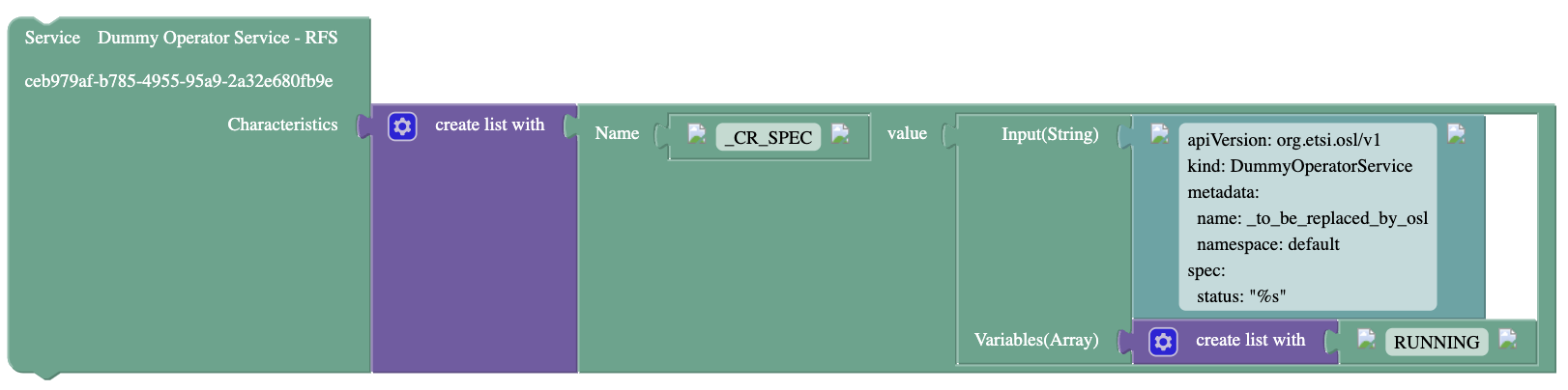 In serviceUnderControl.uuid you should input the UUID of the Service (in the Service Inventory) that you ordered before: the one that relates with the Dummy Operator. For this tutorial, we have used the following characteristic values: