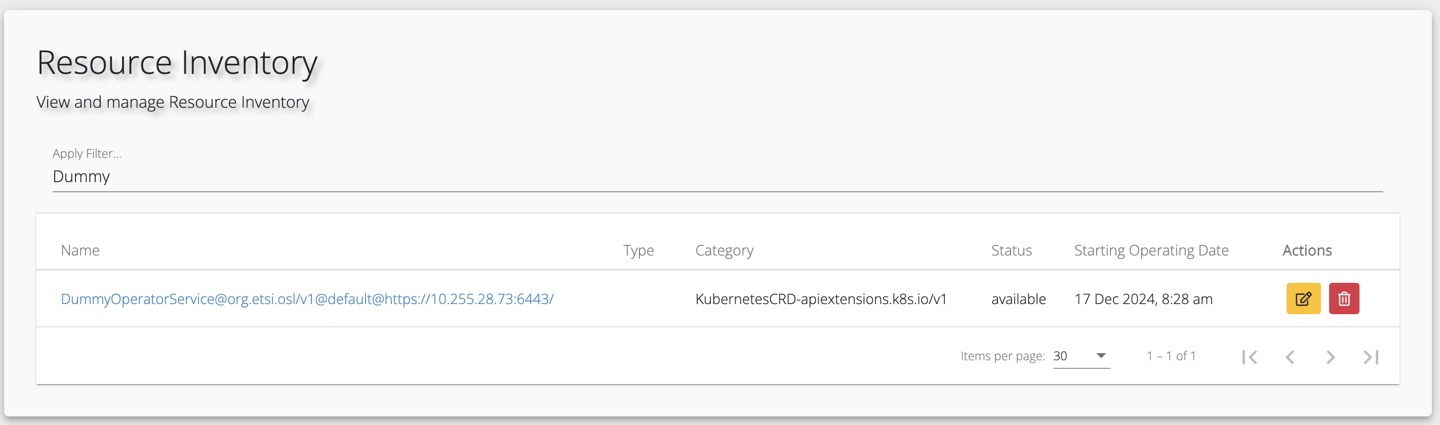 After creating the CRD in your Kubernetes cluster, you may access OSL’s Resource Inventory and you will see the just created resource there.