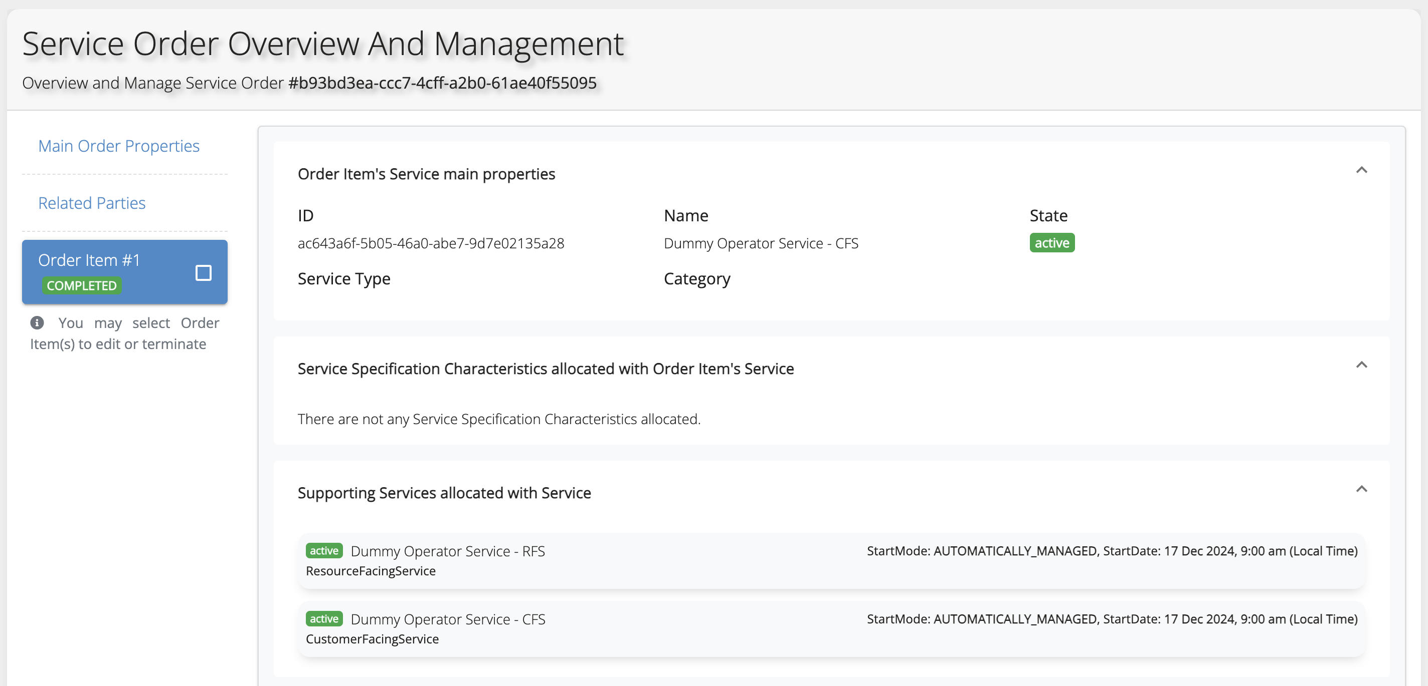 After that, you may expose this service via OSL’s Service Catalog, and order it. You do not need to configure any characteristics when ordering this Service. Confirm that the Service Order was completed, both RFS and CFS Services are active, and a Custom Resource of type DummyOperatorService was created in your Kubernetes Cluster. See images below: