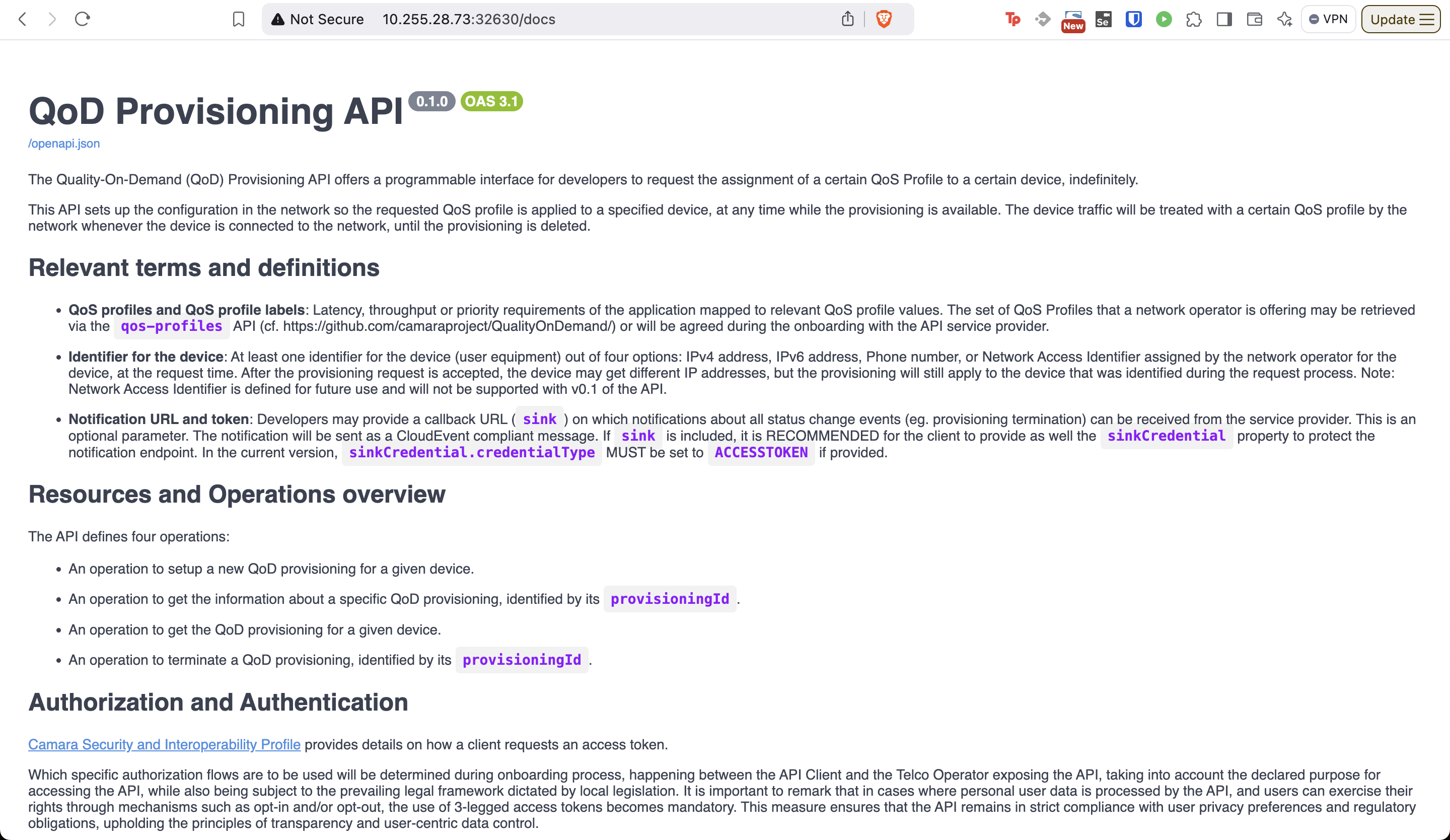 If you see this page, the CAMARA QoD Provisioning API Custom Resources and their operator is working. You may delete the Custom Resource you created. Run the following command: make delete-operator-test-cr.