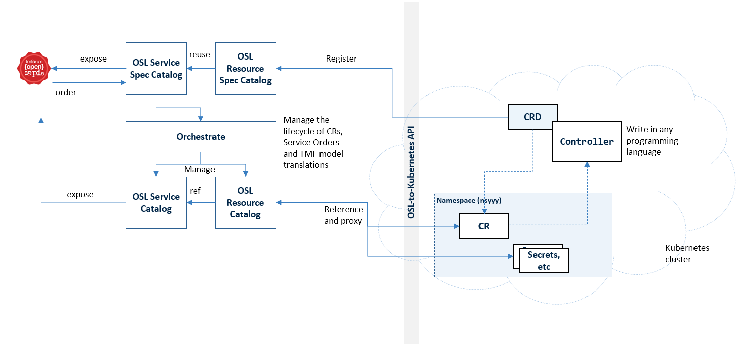 By allowing the design and lifecycle management of services/resources that expose CRDs/CRs in a Kubernetes cluster via the TMF APIs, OSL can be used in many complex scenarios now involing resources from multiple domains.