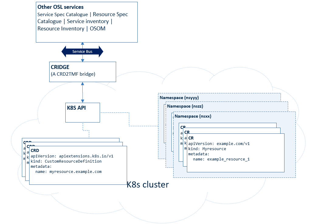 • CRIDGE converts requests towards Kubernetes API and vice-versa, facilitating the integration of custom resources with other OSL services.