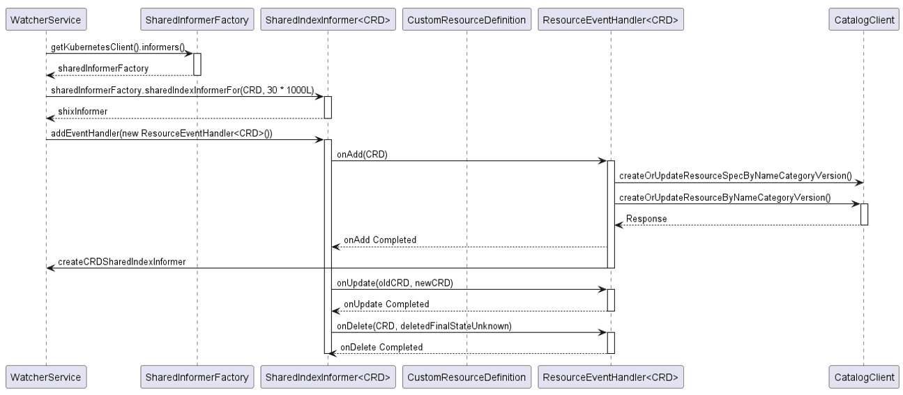 • When we have a newly added/updated/deleted resource of a certain CRD the method updateGenericKubernetesResourceInOSLCatalog is called for this object (fabric8’s GenericKubernetesResource entity)