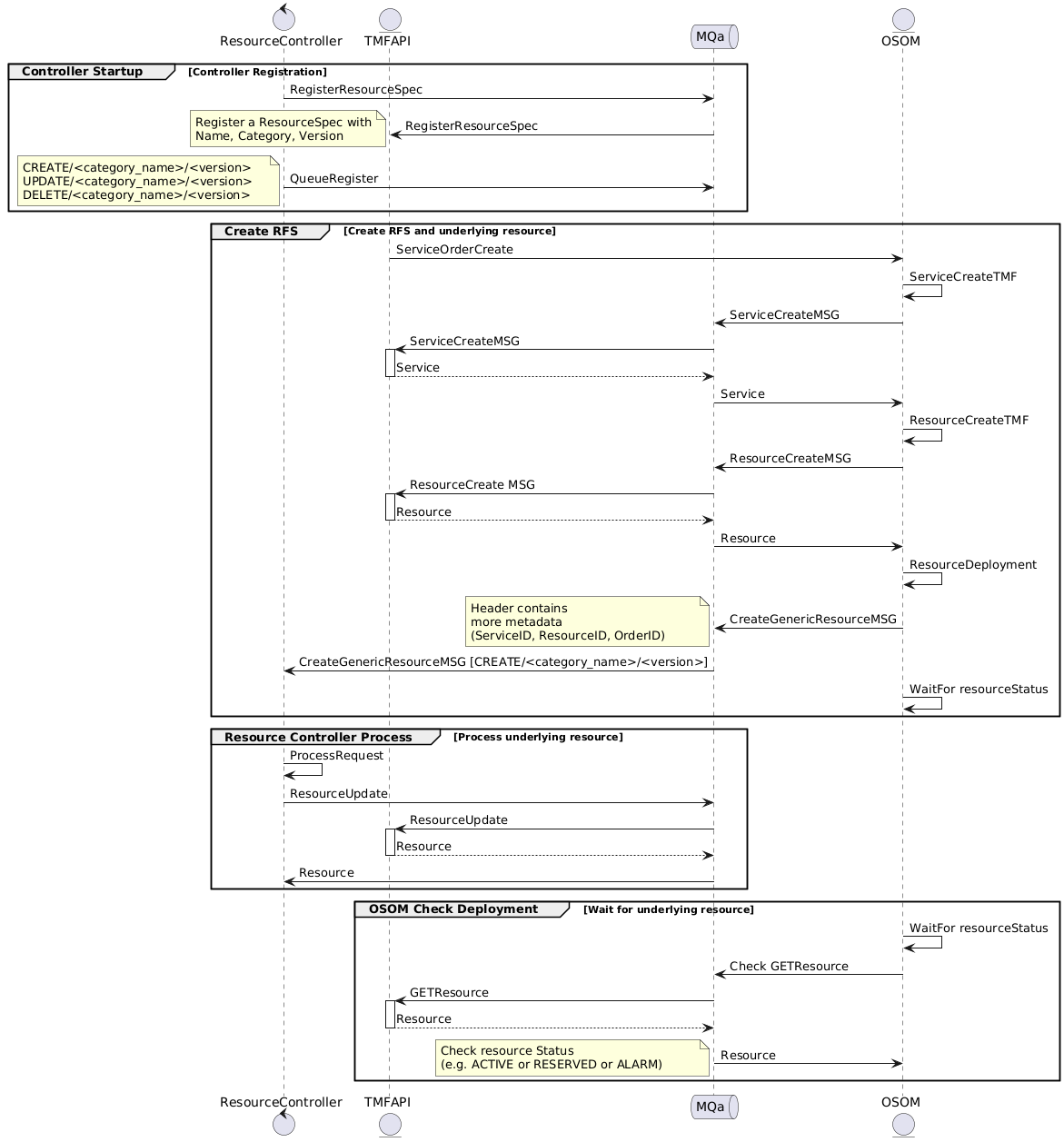 In a nutshell, the Resource Definition/Specification is registered at startup. During Service Orders of related-to-the-specification services, the controller is invoked (via message queue) and a new service and its underlying resource are created, with messages passing between the service and resource layers. The resource controller processes any updates or status changes. OSOM checks the final status of the deployed resource to confirm it is ready or identify any potential errors. The following diagram describes what the resource controller needs to perform, showcasing how the “Resource Controller” component interacts with various services (TMF API, Message Queue MQa, and OSOM) to register the needed resource types, create new resources (Resource Facing Services - RFSs and underlying resources), process updates, and check the resource’s status.