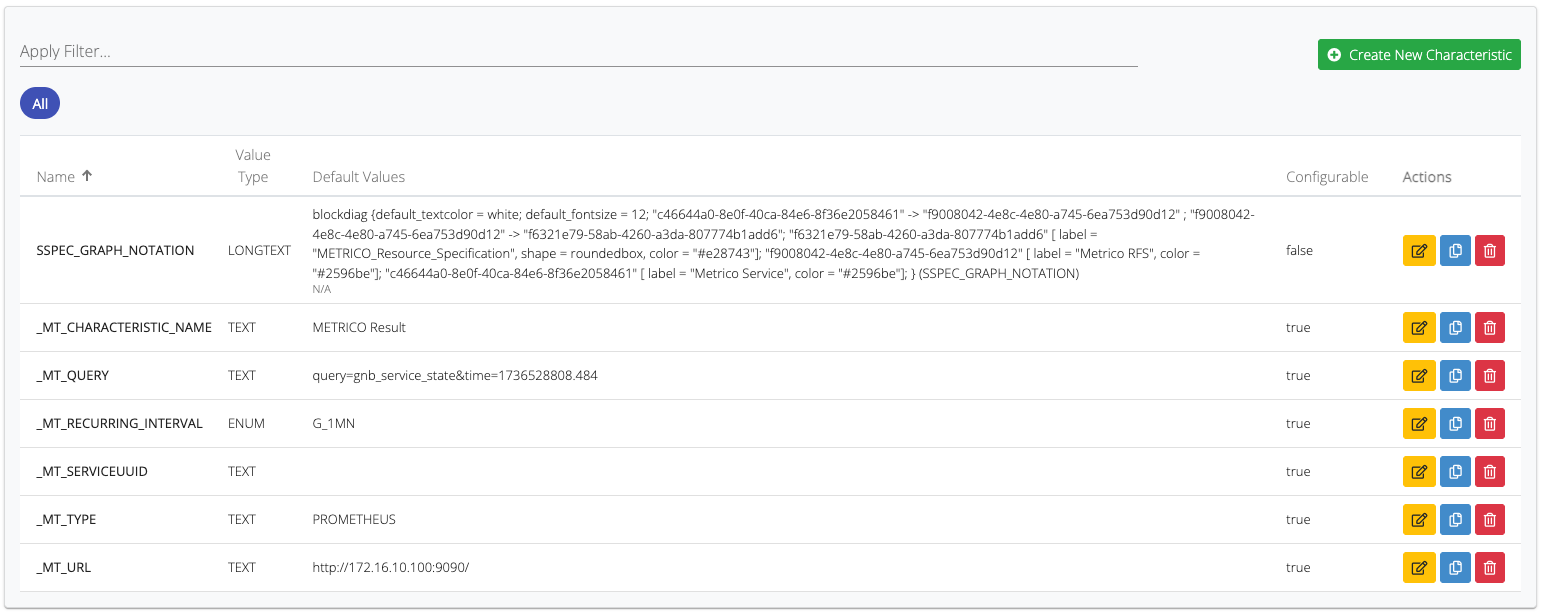 In this example, we will use the METRICO_Resource_Specification that the METRICO component exposes upon instantiation and create a ResourceFacingServiceSpecification (RFSS) to integrate data from a Prometheus instance.