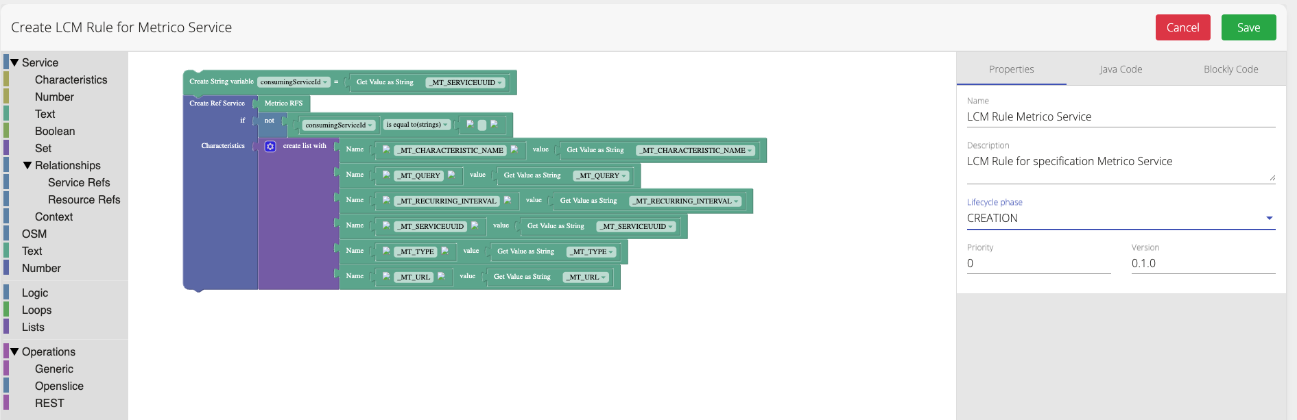 To achieve the above, you should navigate to the "Life Cycle Rules" tab and create a Creation Rule that will prevent the Metrico RFS from starting, unless the _MT_SERVICEUUID is provided. Also, you have to pass the updated user-defined Characteristics from the current to the Metrico RFS, when the previous condition is met. To do so, the rule has to be as the following: